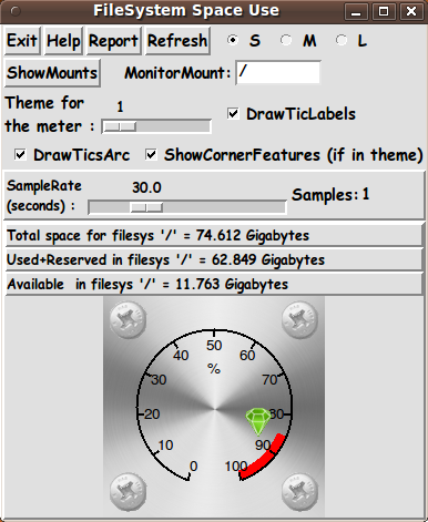 'A Tachometer-style Meter In putting together the code for this GUI, instead of using the 'shadow-circle' technique of Marco Maggi to make nice looking meters, I collected some nice background images and used 'create image' on a Tk canvas widget to make a background for the meter. --- 'Refresh' button: Like with the 'create arcs-and-lines and shadow-circle' file-system-usage GUI, I wanted to supply a 'Refresh' button on the GUI, so that the user can request at ANY TIME, a new query of the space usage data for the mount point (file system) being monitored. This is especially helpful if you have the sampling interval set at some value and you decide that the sampling interval is shorter or longer than needed. You can intervene immediately to change the sampling interval. Simply change the setting of the sampling-interval 'scale' widget and poke the 'Refresh' button. --- The File System (mount point): Like with the 'create arcs-and-lines and shadow-circle' file-system-usage GUI, I wanted to supply a 'ShowMounts' button on the GUI, so that the user can get a list of file-system mount points (directory names) on the computer. The user can use any of those directory names in a 'Mount-to-monitor' entry field on the GUI. --- File System Data Display: For the user-specified mount point, the meter shows, via a 'pointer' on the meter, the percent-used of the total allocated space for the file system. Since it is often nice to know