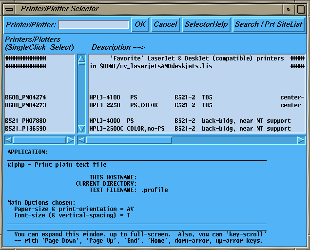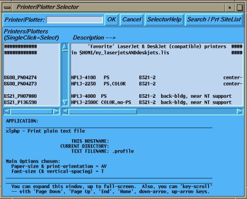 A GUI with two side-by-side list areas, each with horizontal scroll bars Printer-Plotter Queue Selector GUI -- Tk Script Code :