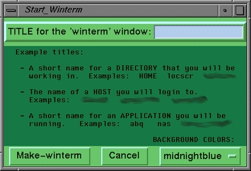 A little more about these tkGUIs : Most of the GUIs below are written so that the title of the GUI (which appears at the top of the window) --- and the labels in front of some of the entry fields --- can be changed by setting the value of an appropriate 'environment variable', such as WIN_TITLE or FE_WINTITLE. (Also fonts and window-interior colors can be set by environment variables.) So the tkGUI scripts are a little more general than the images might imply. Note that most of these images are links to a larger version of the same image. Simply click on the image to see a larger image, in the same window. Then click on the Back button of your web browser window to get back to this page. |