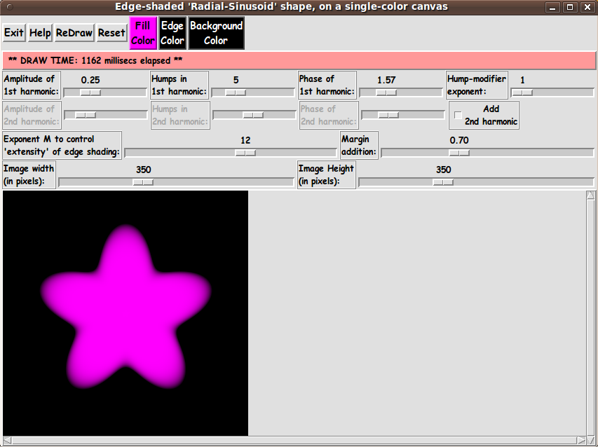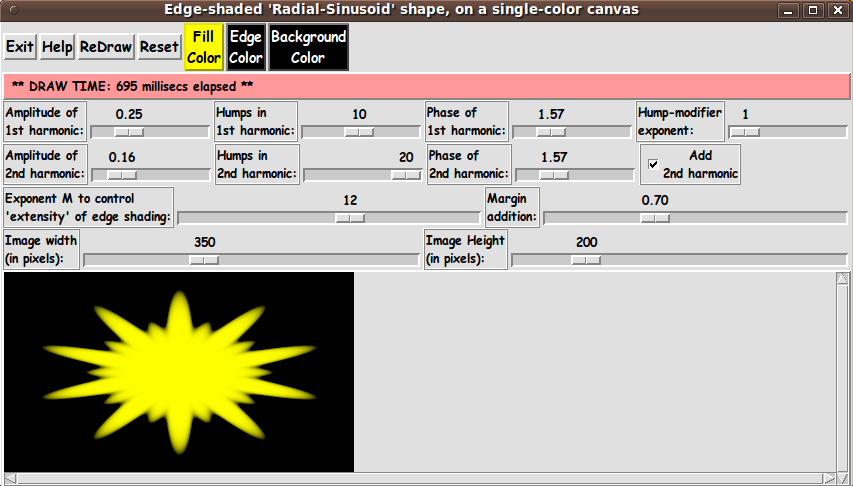 Specifying a radial-sinusoidal shape For this 'radial-sinusoidal' utility, I had in mind 'drawing' a color-filled 'rippled circle' --- including shading to an 'edge color'. By 'rippled circle' is meant a unit-circle whose radius is adjusted by a periodic sinusoidal function. Specifically, the 'rippled circle' is specified in polar coordinates, theta and R(theta), with: R(theta) = 1.0 + A1 * sin(n1*theta + a1) in which 'A1' is an AMPLITUDE, between 0 and 1, and 'n1', the number of 'HUMPS', is an integer, say from 1 to 20, and 'a1' is a PHASE, between 0 and 2*pi. For this utility, the user can choose 'A1' and 'n1' and 'a1', via 'scale' widgets on the GUI, thus allowing for a large variety of 'rippled disks', to be drawn. Even more variety is possible by doing the internal color-shading with millions of color choices for 'fill' and 'edge' colors --- in addition to a user-selectable 'background' color.