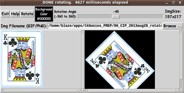 ** GIF or PNG Write My main satisfaction with this code is that it is available now in case I find situations where I do not have a utility available (at reasonable cost) to perform some image processing function involving rotation. With this code, I have a basis from which to build what I need. In fact, I could someday add this rotation capability (code) to A GUI for making 'Title Blocks' ... with text, fonts, colors, images and avoid the screencapture and image editor steps that I went through above. But that would add a lot more complication to that 'Title Blocks' code. There is a lot to be said in favor of the lots-of-little-utilities approach. IN CONCLUSION There's a lot to like about a utility that is 'free freedom' --- that is, no-cost and open-source so that you can modify/enhance/fix it without having to wait for someone else to do it for you (which may be never). I hope to provide more free image-processing scripts that can be used to perform handy operations on images --- or build new images. As I have said on at least one other code-donation page on this wiki ... A BIG THANK YOU to Ousterhout for starting Tcl-Tk, and a BIG THANK YOU to the Tcl-Tk developers and maintainers who have kept the simply MAH-velous 'wish' interpreter going. |