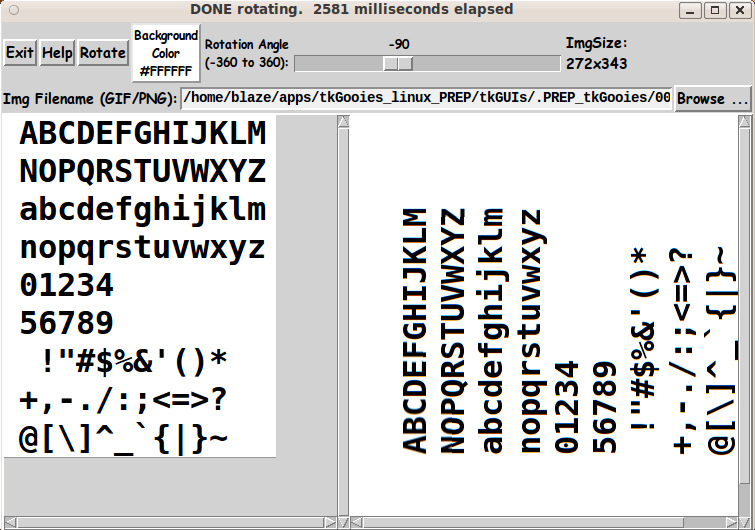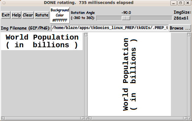 If I wanted to make a transparent image from the image on the right, I would do a screen capture (with 'gnome-screenshot' on Linux) and take the captured PNG file into a text editor ('mtpaint' on Linux) to crop the image and then, when saving the file, choose to save it as either a PNG or a GIF, and choose the color to make transparent (which 'mtpaint' allows you to do). One application that I had in mind for this rotate utility is to rotate text labels 90 degrees for use in y-axis labeling of a plot (even though I can rotate images with 'mtpaint' --- but where's the Tcl fun in that). I made the following black-text-on-white-background with A GUI for making 'Title Blocks' ... with text, fonts, colors, images. I used 'gnome-screenshot' to capture the image in a PNG file, and I used 'mtpaint' to crop the image and save it in a GIF file. Then I read the GIF file into this rotate-image GUI, set the background to white, and clicked on the 'Rotate' button. |
