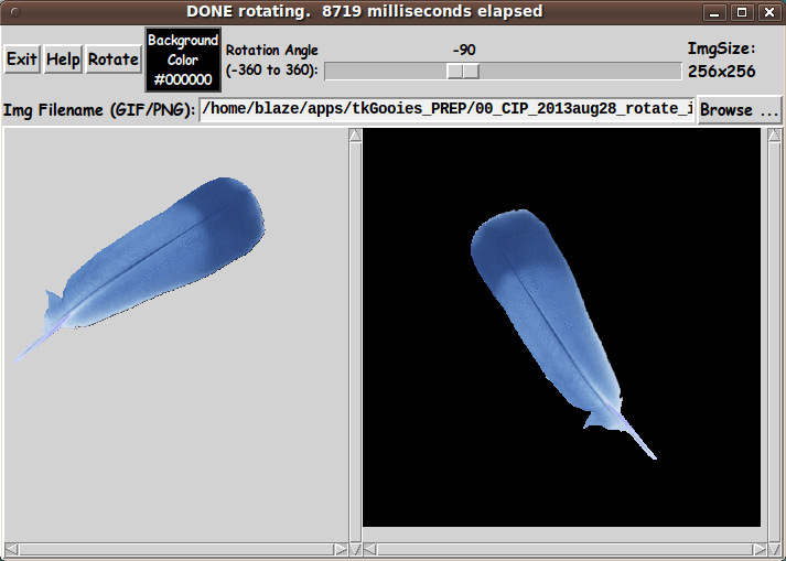 INTRODUCTION to In 2013, I happened to see the page titled 'Photo image rotation' at wiki.tcl.tk. That page was started by 'RS' (Richard Suchenwirth) back in 2002. He used a Tk canvas widget to hold a 'demo' image (a Tcl feather) and built a rotated image (at arbitrary angle) on a 2nd canvas, to the right of the 1st canvas. In 2005, 'DKF' (Donal Fellows) presented another version of the rotate proc that's algorithmically equivalent to RS's but which was optimized for Tcl/Tk 8.4. In any case, it has been about 8 years now, and no one has taken this 'demo' code and made something more like an 'end-user utility' out of it. To me, it seemed it needed a file-browser-selector --- in place of a hard-coded demo image file. And I would like to have the option to lay down a background color behind the rotated image. Then I would be more tempted to use this kind of utility occasionally. I had recently written 'ImageMagnets - a Tk GUI for image processing' --- for spot-bulge and spot-shrink around 'magnet points' on an image. In the process of coding the routine to bulge/shrink disks within an image, I found that mapping colors of pixels from a 'from' image to a 'to' image would not work nicely, because a pixel on the 'from' image would not map precisely on a pixel of the 'to' image. It was a bit of a conundrum, trying to figure out how to spread the color of the 'from' pixel across several 'to' pixels. I found that it made sense to 'march' across the 'to' image and do an inverse mapping from the 'to' image to the 'from' image to find the pixel (or 2 or 3 or 4) to use (via a weighted average) to get the color of the 'to' pixel. For example, if the 'to' mapping was the square of a normalized radius (of a pixel from a 'magnet point'), then the 'inverse' mapping was a square-root of the radius to the 'to' pixel. In any case, I realized that I had the tools to make a 'preliminary stab' at an 'end-user utility' for rotating images --- images read from files supported by the Tk 'image create photo' command --- in particular, GIF and PNG files. (Since I am using Tk 8.5, not 8.6, my testing was done with GIF files. But the code below will probably work with PNG files as well --- with the 8.6 'wish' interpreter.) I started with code from some of my other Tk canvas scripts that had a file-browse-select feature and a background-color select feature, and ended up with the GUI seen in the following image. |