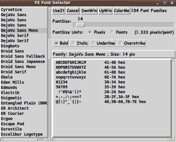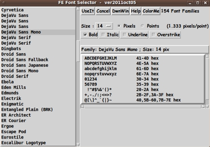 The code for this font selector GUI is about twice as long (in bytes/characters) as the code for the color selector GUI. Part of the reason it is so long is that I have 'left in' many of my comments that explain the usage of the GUI and the structure and intent of the code. The comments may be helpful to Tcl-Tk 'newbies' -- to help them read the code. The code can be helpful, to give some examples of using widgets not used in the color selector GUI script --- to aid Tcl-Tk 'newbies' who are looking for code samples. (Even though it might take more than 30 PageDown key strokes to page through this code image, when considered in bytes, the file holding this code is less than 2% of the size of the typical JPEG file from a 12 megapixel digital camera.) The widgets The widgets in this font selector GUI include a 'listbox' (with y-scrollbar), a 'text' widget with both x and y scrollbars, 'radiobutton' widgets, 'checkbutton' widgets --- even a 'tk_optionMenu' button widget (a predecessor of the newer 'spinbox' widget). Alternatively, I could replace the 'tk_optionMenu' button with the 'spinner' proc at the 'spinbox' page at 'wiki.tcl.tk'. It is "a concoction of a 1-line high listbox with two tiny buttons", so it would run with old 7.x wish interpreters. Maybe I will do that --- someday.
