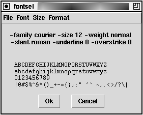 Some titles on that site: And there is the code for yet another font chooser in the book 'Practical Programming in Tcl and Tk' (4th edition) by Brent Welch, Ken Jones, and Jeffrey Hobbs --- page 643 --- where this image is shown --- along with the code used to generate it. |